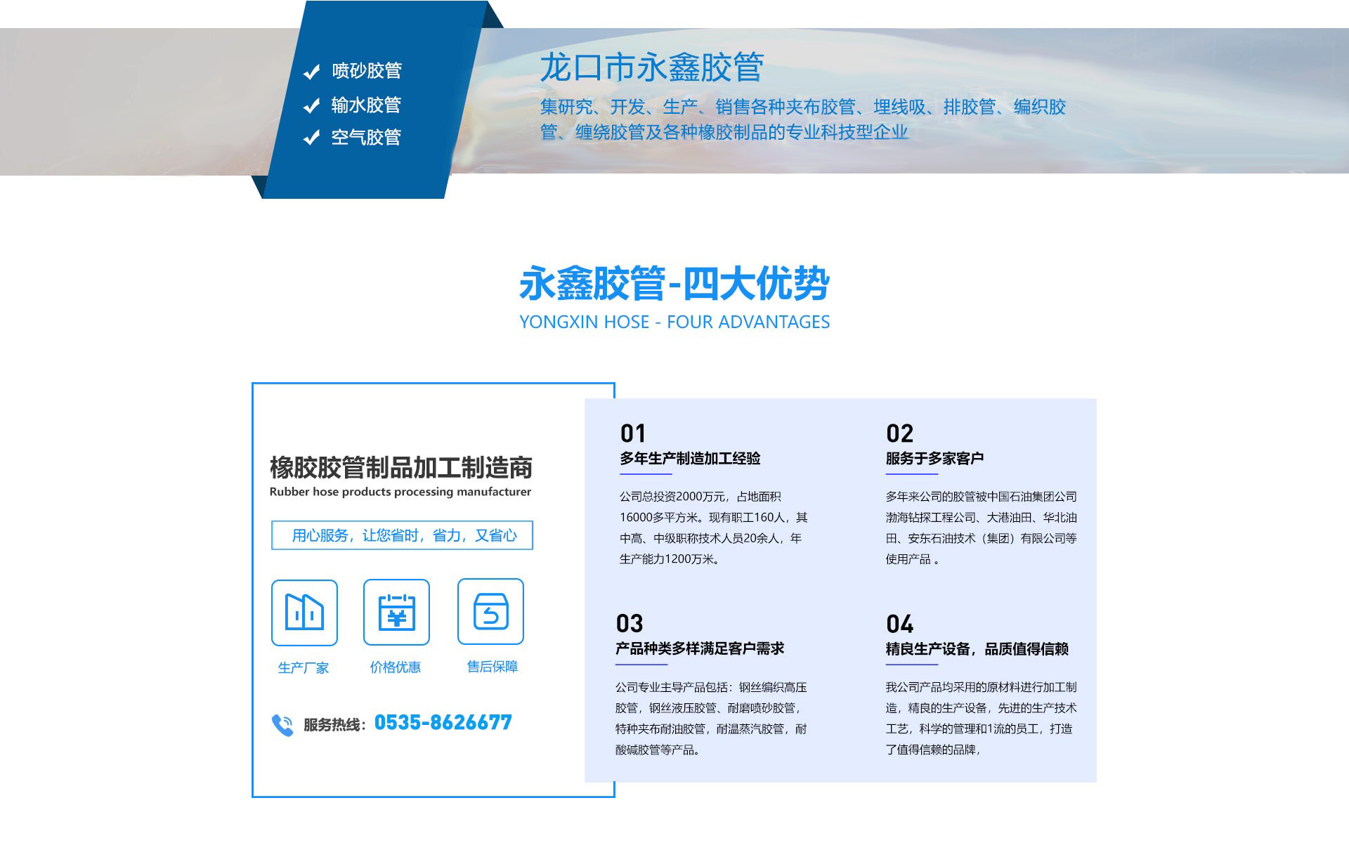 龍口市永鑫膠管有限公司始建于1979年。位于山東半島北端——龍口市,毗鄰龍口港、威烏高速公路和大萊龍鐵路,商業運輸,交通方便,地理位置好。公司總投資2000萬元,占地面積16000多平方米?,F有職工160人,其中高、中級職稱技術人員20余人,年生產能力1200萬米。多年來公司的膠管被中國石油集團公司渤海鉆探工程公司、大港油田、華北油田、安東石油技術(集團)有限公司等使用產品我公司迎著十八界三中全會的改革大潮始終闊步向前,目前我公司主要從事高低壓橡膠軟管、鉆探膠管、夾布膠管、噴砂膠管、橡膠管帶制品,等產品的生產和研發,主導產品包括:生產,研制高低壓橡膠軟管、輸送皮帶等以橡塑為主的產品,擁有各類進口,國產生產設備120多臺套,化驗,分析,試驗儀器設備種類多,檢測手段完善。我公司產品均采用的原材料進行加工制造,精良的生產設備和穩定技術工藝,科學的管理,打造了客戶信任的牌子,先后與多家石油、化工、汽車制造等大型國有企...